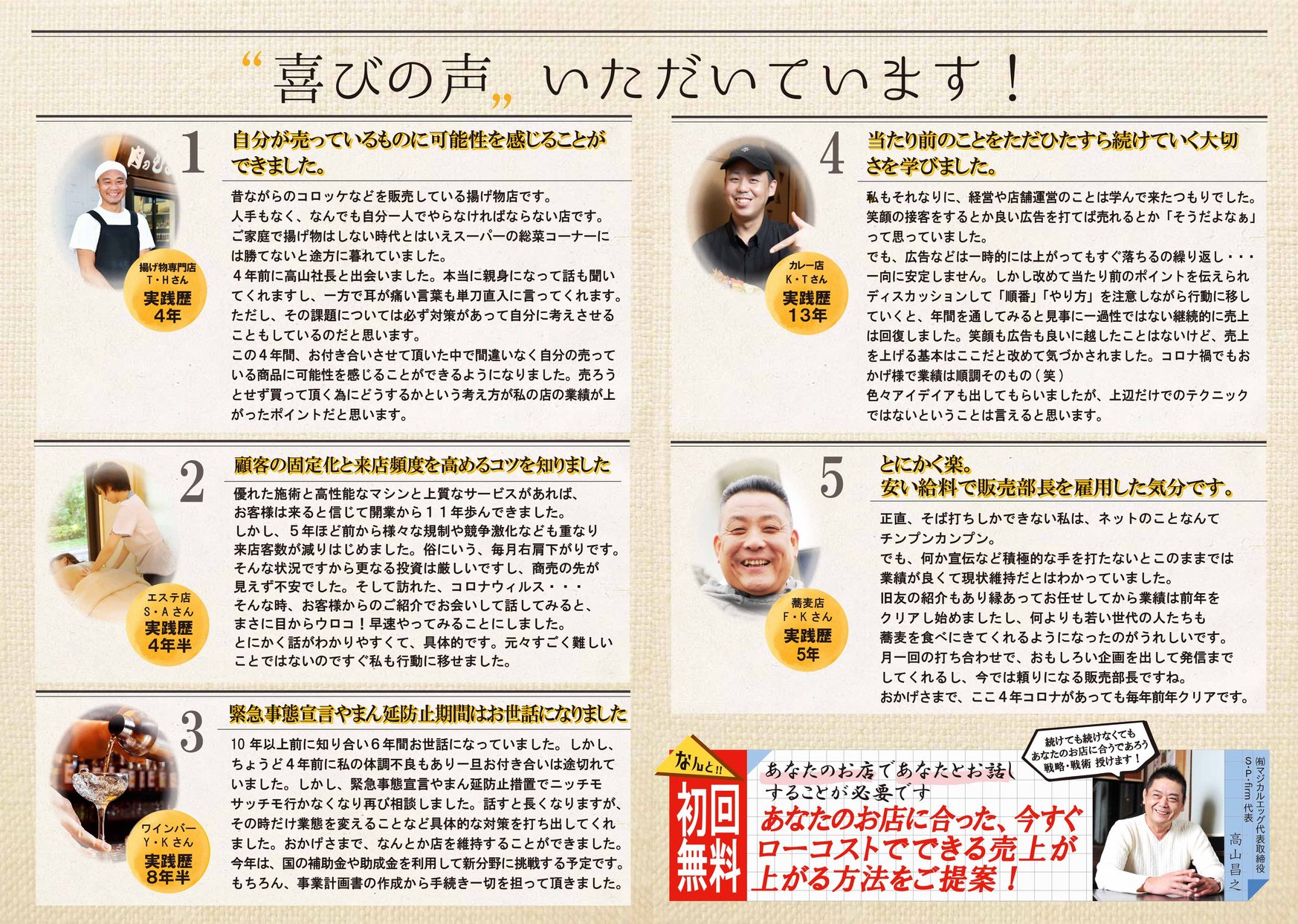 二年前に全事業を手放した高山は、先行きの見えない不安と孤独と戦う小規模事業者支援に専念しています。「集客・資金繰り・メンタルケア」の三本柱で経営者を支え、「どん底から這い上がった」自身の経験と「ズルをしない」「経営者に全力で寄り添う」をモットーに、どんな景気でも成功できる仕組み作りを信念に全力でサポートしています。
